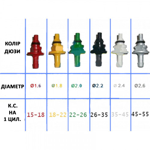 Конструкция рампы предусматривает при необходимости смену штуцеров калибровки на штуцеры иного диаметра, при необходимости увеличить или уменьшить подачу топлива в коллектор автомобиля. В комплекте представленной рампы находятся штуцеры калибровки из качественного пластика. Внутреннее сечение штуцера 1.6 мм, 1,8 мм, 2,0 мм, 2,2 мм, 2,4 мм и 2,6 мм, которые рассчитаны на мощность автомобиля от 55 лошадиных сил (14 л.с./цилиндр).