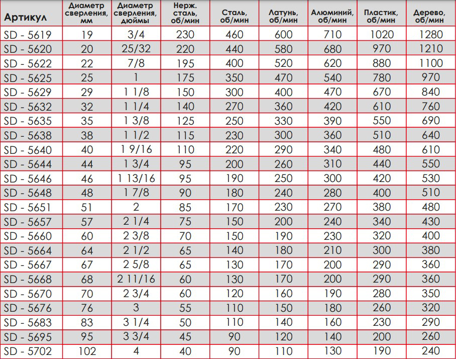 Максимальное количество оборотов в минуту при сверлении для различных материалов
