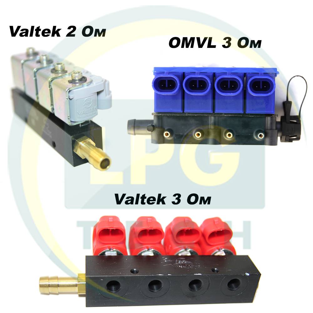 - Valtek Type 30. 4 цилиндровая рампа с сопротивлением катушек 3 Ом. В комплекте со штуцерами 1,5 мм;
