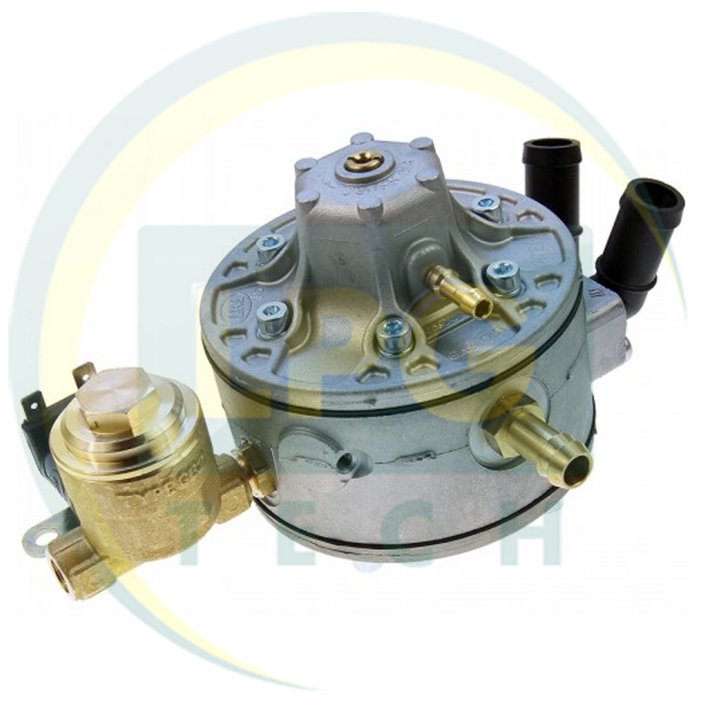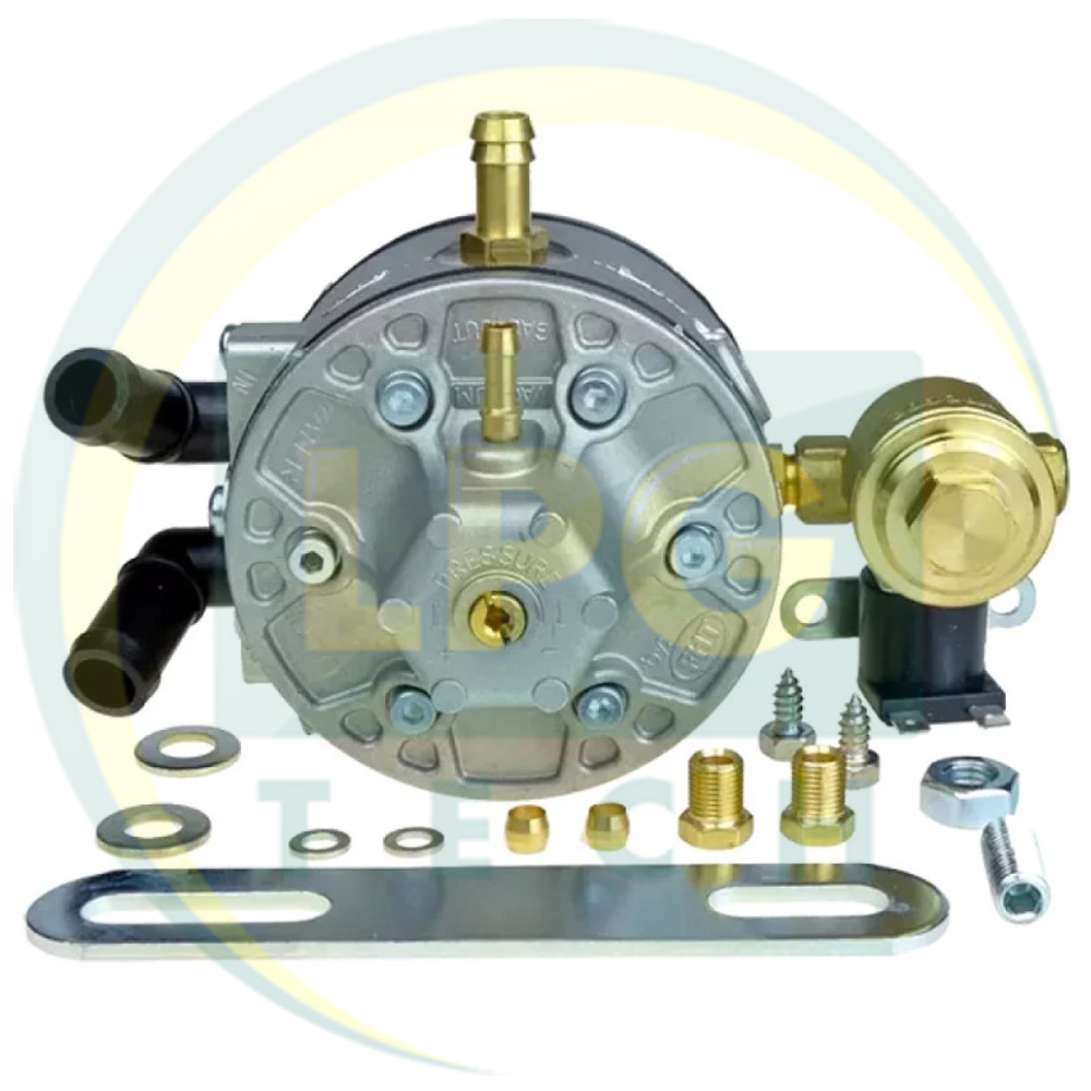 Это одноступенчатый редуктор, разработанный специально для использования с пропан-бутаном (LPG). Вход газа разработан под трубку диаметром 6 мм с резьбой М10х1. Для подогрева редуктора здесь расположены два тосольных штуцера под рукав с внутренним диаметром 16 мм. Выход газа – 12 мм. Вакуумный штуцер – 5 мм.