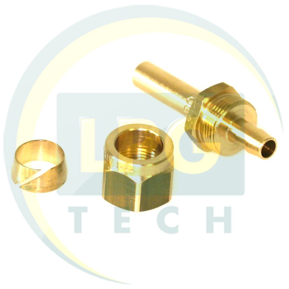 Соединитель для пластиковой трубки с одной стороны фиксирует трубопровод, а с другой стороны имеет наконечник под гайки и бочонки, которые применяют и для медной трубки 8 мм. Трубку и штуцер 8 мм могут устанавливать как в качестве заправочной магистрали (от газового баллона до заправочного устройства) так и в качестве расходной магистрали (от пропанового баллона до редуктора или клапана газа в подкапотное пространство атомобиля).
