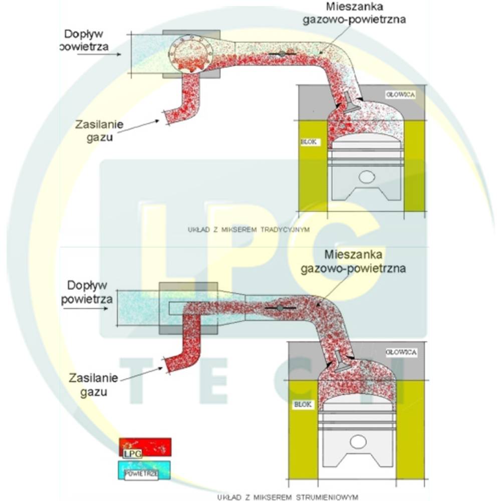 Потоковый смеситель назван так, потому что устанавливается по ходу потока воздуха. Производит оптимальное смешивание газа и воздуха, и данная смесь будет использоваться в качестве альтернативного двигательного топлива. Монтируется внутри гофрированного патрубка как указано на картинке. При этом газовый штуцер выводят наружу.
